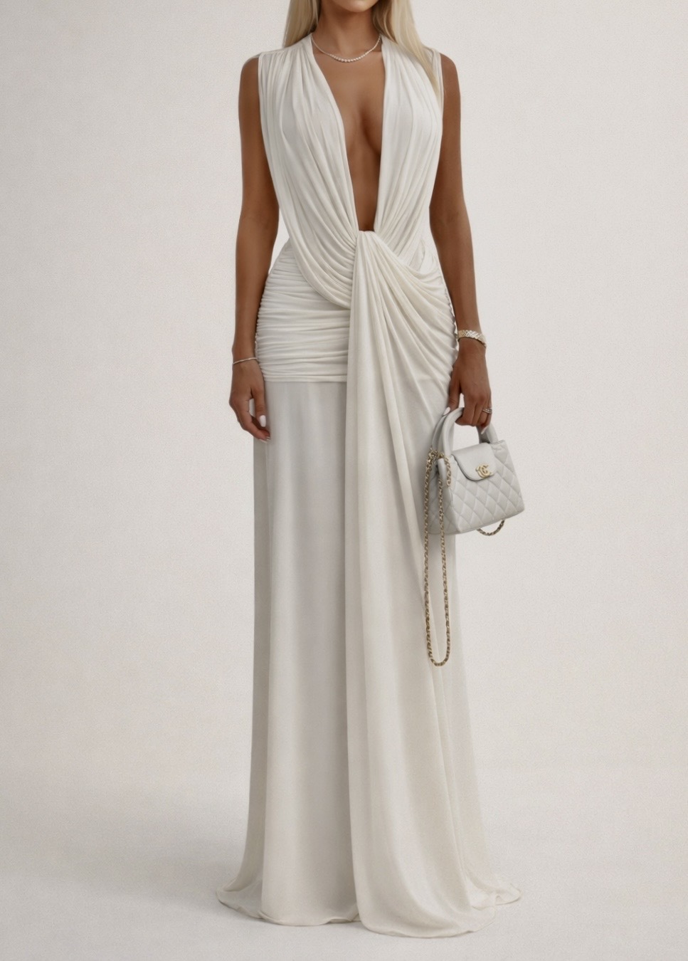 The fluid fabric gathers delicately at the waist, enhancing the feminine shape while allowing graceful movement. A high leg slit adds a bold yet refined touch, while the open draped back creates an unforgettable statement from every angle.