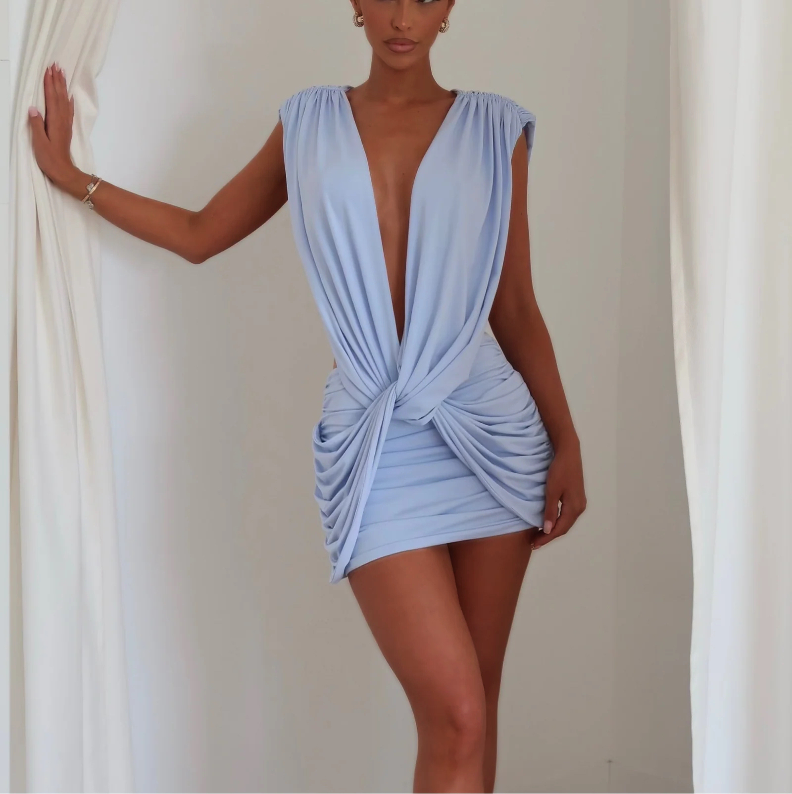 Lilou is the ultimate statement of feminine confidence. Designed in a soft baby blue tone, this mini dress features a plunging neckline and artfully draped detailing that sculpts and enhances the silhouette with effortless elegance.
